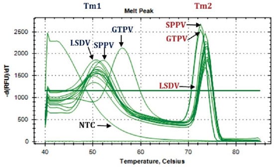 Melting peaks (Tm) of samples from Nepal compared to the positive control of GTPV, SPPV, and LSDV. Both melting temperatures for the snapback stem (Tm1) and the PCR amplicons (Tm2) are shown.