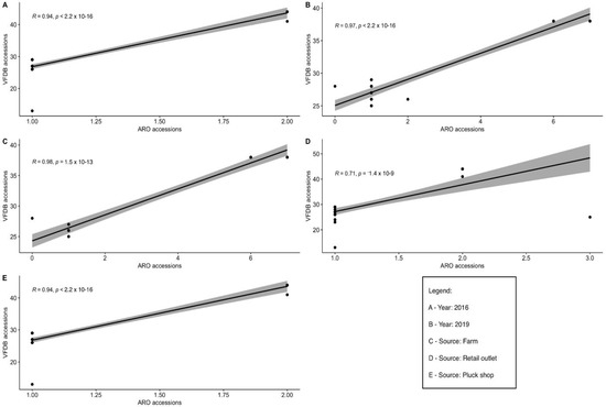 Comparisons between the possession of virulence factors (VFDB accessions) and AMR genes (ARO accessions) across serovars were performed and detected 10 sources and years (farm-to-fork, hatcheries, processing plants, retail outlets, ‘pluck shops’, supermarkets, 2016, 2017, 2018, and 2019). Statistically significant positive correlations in Salmonella serovars isolated from farms, retail outlets, and ‘pluck shops’, as well as those isolated in 2016 and 2019 were detected, respectively (p < 0.05) (Figure 1). Negative and non-significant positive correlations are not displayed.