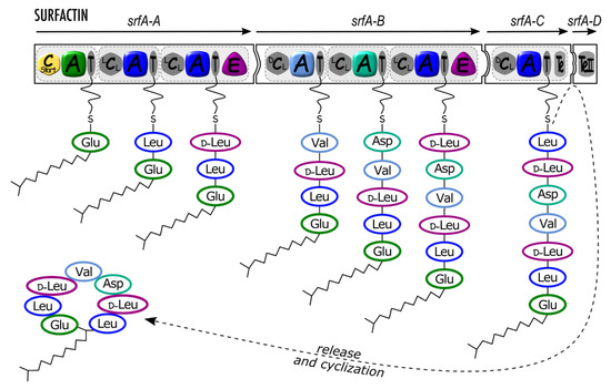 Surfactin synthetase architecture and schematic mode of synthesis. srfA-A, srfA-B, srfA-C, and srfA-D (arrows) are genes coding four synthetase proteins (black-framed puzzle pieces) organized in modules (light grey dotted rectangles with rounded corners) including domains as follows: Cstart (yellow hexagon): condensation starter domain; A (colored rounded square), adenylation domain; T (grey ellipse), thiolation domain (also called peptidyl carrier protein) carrying a phosphopantetheinyl (pPant) swinging arm; E (purple rounded triangle), epimerization domain; LCL, DCL (grey hexagon), condensation domain; Te, TeII (grey rounded rectangle), thioesterase domain. Incorporated amino acids (three-letter code) are circled with the respective A domain or E domain color.