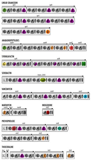 - Stachelhaus, T.; Mootz, H.D.; Marahiel, M.A. The specificity-conferring code of adenylation domains in nonribosomal peptide synthetases. Chem. Biol. 1999, 6, 493–505. [Google Scholar] [CrossRef]