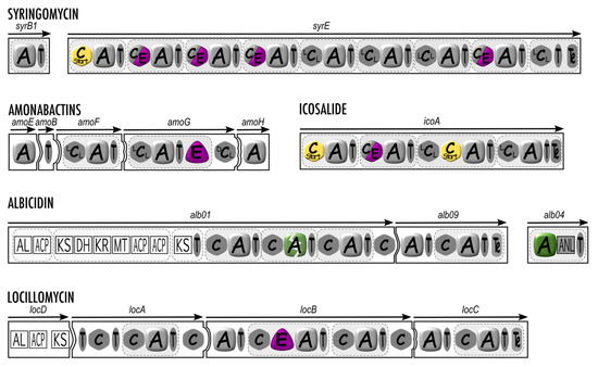 Structural organization of syringomycin, amonabactins, icosalide, albicidin, and locillomycin synthetases with an “out of the rules” mode of biosynthesis. A, adenylation domain; C (LCL, DCL, or Cstart), condensation domain; C/E, dual condensation and epimerization domain; T, thiolation domain; E, epimerization domain; MT, methyl transferase domain; AL, acyl-CoA ligase domain; ACP, acyl carrier protein; KS, ketosynthase domain; DH, dehydrogenase domain; KR, ketoreductase domain; ANL, α-ANH-like domain. The nonfunctionnal second A domain of albicidin synthetase is depicted with a green broken rounded square. The white squared domains are related to PKSs.