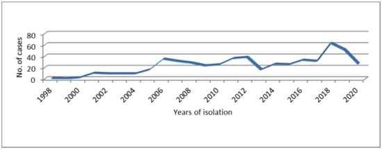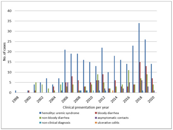 The distribution of STEC O145 by year, according to the disease presentations between 1998 and 2020, is shown in Figure 2.