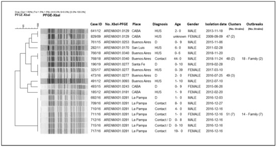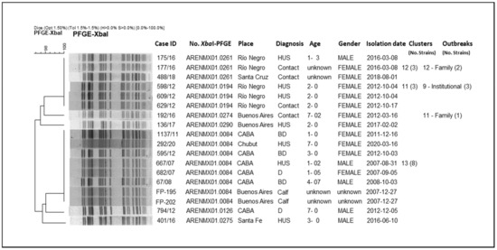 In Figure 3, it is shown how these strains are grouped into an entire branch, presenting patterns with at least more than 93% similarity; they correspond to four clusters and five unique patterns. The clusters are: No. 51 (pattern ARENMX01.0281; 7 strains); No. 48 (pattern ARENMX01.0340; 2 strains); No. 49 (pattern ARENMX01.0277; 3 strains); and No. 47 (pattern ARENMX01.0129; 2 strains). The cluster No. 51 and No. 48 correspond to family outbreaks. The first includes the index case and six family contacts with diarrhea (outbreak No. 14/La Pampa, 2016). The second one corresponds to two strains isolated from an HUS case and his father, an asymptomatic contact (outbreak No. 18/Buenos Aires, 2018). Cluster No. 47 includes two HUS cases (occurred at the same location and different times), and cluster No. 49 presents one HUS and two diarrhea cases (different place and time). The five unique patterns were detected once in the entire period of study.