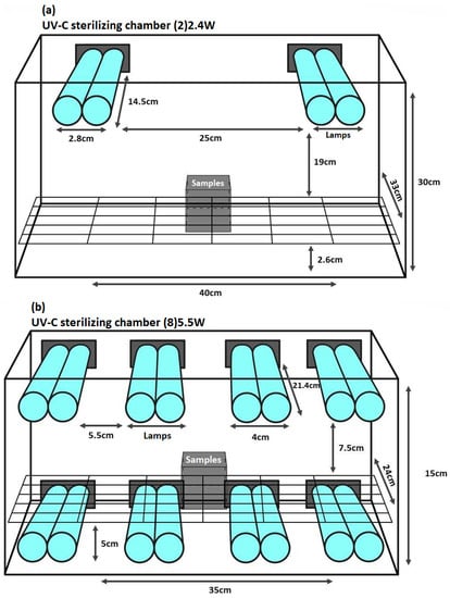 UV-C light disinfection systems. (a) UV-C sterilizing chamber (2)2.4W; the samples were placed approximately 20 cm from the two lamps and (b) UV-C sterilizing chamber (8)5.5W; the samples were placed approximately 7 cm from the top four lamps and approximately 2 cm from the bottom four lamps.