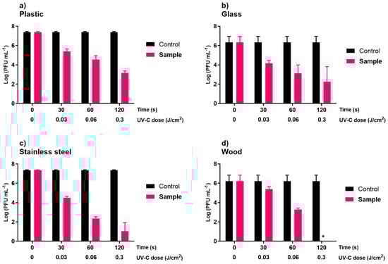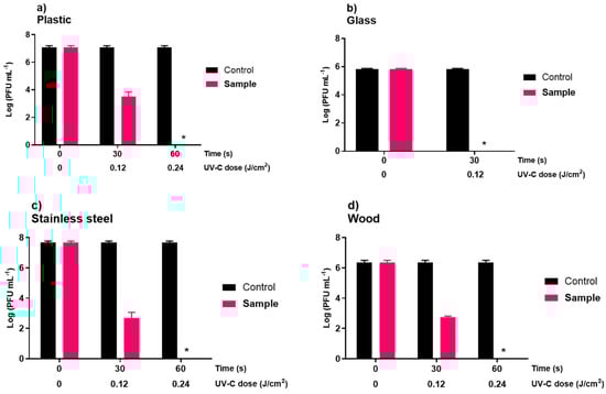Inactivation of phage ϕ6 by the UV-C sterilizing chamber (2)2.4W on inanimate surfaces: plastic (a), glass (b), stainless steel (c), and wood (d). Limit of detection was about 2.3 log PFU/mL Values represent the mean of the three experiments and error bars represent the standard deviation. * below the methods’ detection limit.