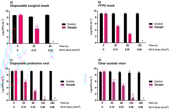 Inactivation of phage ϕ6 by the UV-C sterilizing chamber (8)5.5W on disposable surgical (a) and FFP2 (b) masks, disposable protective vest (c), and clear acetate visor (d). Limit of detection was about 2.3 log PFU/mL Values represent the mean of the three experiments and error bars represent the standard deviation. * below the methods’ detection limit.