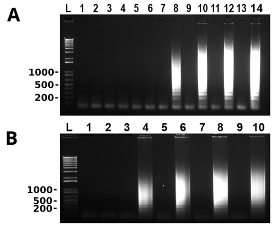 Optimization of LAMP assay for the detection of T. tenax. Odd and even lanes are without and with T. tenax genomic DNA (100 ng), respectively. (A) Temperature optimization of LAMP reaction: lanes 1 and 2, lanes 3 and 4, lanes 5 and 6, lanes 7 and 8, lanes 9 and 10, lanes 11 and 12 and lanes 13 and 14 are at 50, 53, 55, 58, 60, 63 and 65 °C, respectively. (B) Time optimization of LAMP reaction: lanes 1 and 2, lanes 3 and 4, lanes 5 and 6, lanes 7 and 8 and lanes 9 and 10 are at 15, 30, 45, 60 and 75 min, respectively. L: 100 bp DNA ladder marker. One of three repeats is shown.