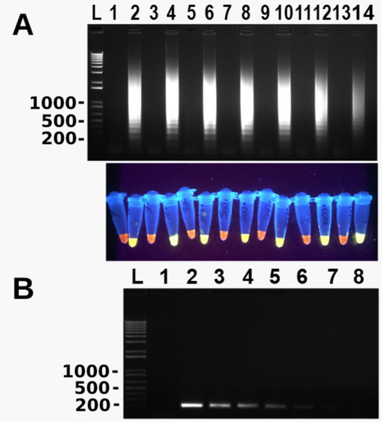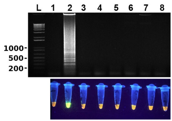 The amplified products were visualized using gel electrophoresis and SYBR Green I (Thermo Fisher Scientific, Waltham, MA, USA). For gel electrophoresis, 10 µL of the product was separated on 1% agarose gel containing 0.5 mg/mL ethidium bromide with a 100 bp ladder of DNA marker (Invitrogen, Carlsbad, CA, USA). For detection using SYBR Green I, 1 µL of SYBR Green I was added to 10 µL of the product and examined under UV light. Fluorescent green color is an indication of a positive reaction and orange color is an indication of a negative reaction.