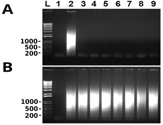 Detection of T. tenax without DNA extraction by newly developed LAMP assay. Serially diluted samples of T. tenax cells in PBS (A) or TE buffer (B) boiled at 100 °C for 30 min: lanes 1 and 2: negative and positive controls without and with T. tenax genomic DNA (100 ng/µL); lanes 3–9: containing 2 × 105, 2 × 104, 2 × 103, 2 × 102, 2 × 101, 2 × 100 and 2 × 10−1 cells, respectively. L: 100 bp DNA ladder maker. One of three repeats is presented.