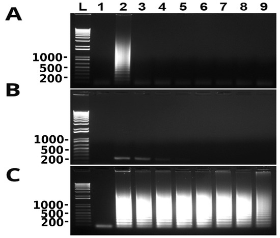 Limit of detection in spiked saliva samples as shown in gel electrophoresis. (A) LAMP. (B) PCR. Lane 1: nuclease-free water as a negative control; lane 2: positive controls with 100 ng T. tenax genomic DNA; lanes 3–9: canine saliva spiked with 2 × 105, 2 × 104, 2 × 103, 2 × 102, 2 × 101, 2 × 100 and 2 × 10−1 cells, respectively. They were boiled at 100 °C for 30 min with no DNA extraction. (C) LAMP using the similarly prepared samples as above that were re-suspended in TE buffer after being washed in PBS. L: 100 bp DNA ladder marker. One of three repeats is presented.
