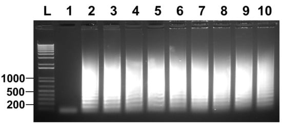 Direct detection of T. tenax among clinical samples without prior DNA extraction. Lane 1: nuclease-free water as a negative control; lane 2: positive controls with 100 ng T. tenax genomic DNA; lanes 3–10: eight microscopically confirmed trichomonad samples of individually owned pet dogs containing two cells per sample. LAMP results are detected by gel electrophoresis. One of three repeats is presented.