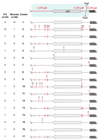 Analysis of genetic variations in IGRs controlling expression of the icaADBCR locus. PJI and wound isolates were grouped into seventeen different clusters according to SNPs present in the 3′UTR of icaR, the icaR coding sequence, and the IGR between icaR and icaA when compared to the sequence of the reference strain MW2 (cluster 1). The red lines show the SNPs or indels found. All sequence variations found in cluster two are depicted (nucleotide changes from a black to a red nucleotide in the upper strand). In the rest of the clusters, only the sequence variations that are different from the ones found in cluster two are detailed.