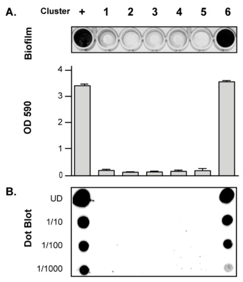 Biofilm formation capacity and PIA/PNAG production analyses of one representative S. aureus PJI isolate of clusters one to six. Cluster 1: MIC 6935; cluster 2: MIC 6924; cluster 3: MIC 6934; cluster 4: MIC 6936; cluster 5: MIC 6948; cluster 6: MIC 7018. (A) Biofilm phenotype on polystyrene microtiter plates after 24 h of growth at 37 °C in TSB-NaCl medium. Bacterial cells were stained with crystal violet, and biofilms were quantified by solubilizing the crystal violet with alcohol-acetone and determining the absorbance at 590nm. The error bars represent the standard deviations of the results of three independent experiments. (B) Quantification of PIA/PNAG exopolysaccharide biosynthesis by dot-blot. Samples were analyzed after 16 h of static incubation in TSB-NaCl at 37 °C. Serial dilutions (1/10) of the samples were spotted onto nitrocellulose membranes and PIA/PNAG production was detected with specific anti-PIA/PNAG antibodies. UD; undiluted sample. +; a strong PIA/PNAG dependent biofilm forming strain was included as a control.