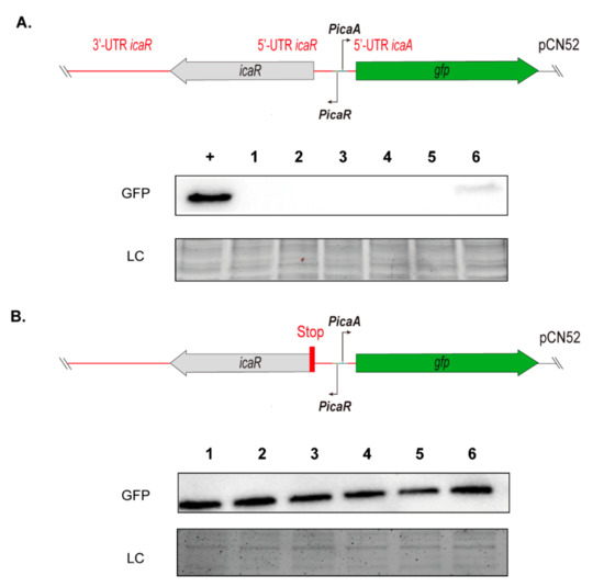 Overnight cultures of S. aureus 132 ica::tet transformed with pCN52::IGRica or pCN52::IGRStopica plasmids were diluted 1:100 and grown in TSB supplemented with 3% NaCl (TSB-NaCl) at 37 °C under static conditions. Samples were collected when the OD 590nm reached a value of 0.7. Cells were re-suspended in phosphate buffered saline (PBS) and lysed using a FastPrep-24™ 5G (MP Biomedicals, LLC, Irvine, CA, USA). Supernatants from total protein extracts were recovered and analysed by SDS-PAGE and Western blotting, as follows. A volume of Laemmli buffer was added to the samples and boiled for 5 min; 4 µg of protein was used for SDS-PAGE analysis with the TGX™ Stain-Free FastCast™ Acrylamide Kit, 12% (Bio-Rad, Hercules, CA, USA). For Western blot analysis, protein extracts were blotted onto AmershamTM ProtranTM Premium 0.45 µm nitrocellulose blotting membranes (Cytiva, Marlborough, MA, USA) by electroblotting. Membranes were blocked overnight in PBS containing 0.1% Tween 20 and 5% skimmed milk under shaking conditions, and incubated with anti-GFP antibodies (Living Color A.v. monoclonal antibody JL-8 Clontech, Mountain View, CA, USA), diluted 1:2500 in blocking solution for 2 h at room temperature. Alkaline phosphatase conjugated goat anti-mouse immunoglobulin G (Sigma-Aldrich, St Louis, MO, USA), diluted in blocking solution, was used as a secondary antibody, and the subsequent chemiluminescence reaction was recorded with ECL Prime western blotting detection reagents (Cytiva, Marlborough, MA, USA) in a ChemiDoc MP Imaging System (Bio-Rad, Hercules, CA, USA).