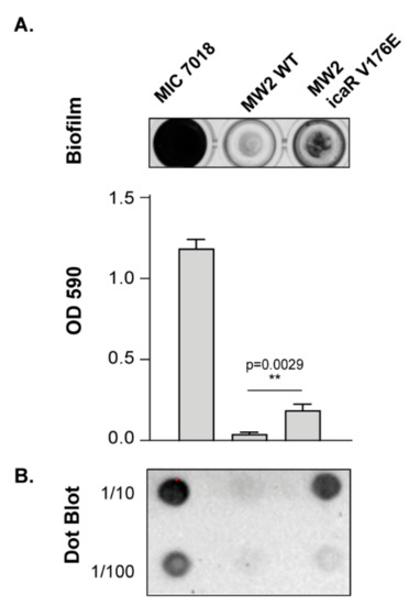 - Jefferson, K.K.; Cramton, S.E.; Götz, F.; Pier, G.B. Identification of a 5-nucleotide sequence that controls expression of the ica locus in Staphylococcus aureus and characterization of the DNA-binding properties of IcaR. Mol. Microbiol. 2003, 48, 889–899. [Google Scholar] [CrossRef] [PubMed] [Green Version]