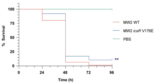 Galleria mellonella infection with S. aureus MW2 wild type and MW2 icaR V176E mutant strains. Groups of larvae (25/group) were inoculated with 10 μL PBS (uninfected control group) or bacterial suspensions containing 107 CFU of the corresponding strain, into the last proleg and incubated at 37 °C. Worms were checked daily, and any deaths were recorded every 24 h, for a total of four days. Three independent experimental trials were performed. Survival data were plotted using the Kaplan-Meier method and expressed as a percentage of survival versus time. Statistically significant differences were determined using the log rank test (**, p < 0.01).