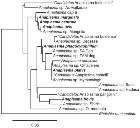 The genus Anaplasma contains obligate intracellular bacteria capable of colonizing both mammalian and arthropod cells. Currently, the genus consists of seven formally named species: A. marginale, A. centrale, A. ovis, A. bovis, A. phagocytophilum, A. platys and A. caudatum [,]; however, since the last taxonomic organization of the genus [] at least 25 new species have been proposed in the literature. These proposed species range from clinical isolates of infected animals to unique sequence variants detected in broad multi-species-based 16S rRNA metagenomic studies. Some, such as the proposed “A. capra”, represent an important source of human and animal disease [,,], while others appear as single, orphan isolates from unique animal hosts.
