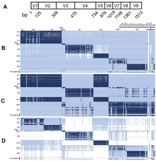 Comparisons of Anaplasma 16S rRNA sequences. (A) A map of the variable regions of 16S rRNA sequence A. marginale St. Maries strain. The start of each variable region was determined by the beginning of the conserved portion of the given variable region. Panels (B–D) are colorized representations of sequence identity matrices of regions of the 16SrRNA gene for known and putative Anaplasma species. (B) Comparison of the near-full-length (V2–V9 regions) 16S rRNA sequence identity for 294 sequences of Anaplasma. (C) Comparison of the V3–V4 regions of 16S rRNA sequence identity 294 Anaplasma sequences. (D) Comparison of concatenated V2 and V6 regions of 16S rRNA sequence identity 294 Anaplasma samples. In (B–D), each box represents a single 16S rRNA sequence of the indicated species of Anaplasma. Dark blue shading represents shared identity above or equal to 98.7% with white representing shared identity below 95%. Light blue shading represents identities between 95–98.7%. Coding is as follows: Ac: A. centrale; Am: A. marginale; Ao: A. ovis; Mon: Anaplasma sp. Mongolia; Boo: “Candidatus A. boleense”; Ab: A. bovis; Aca: A. capra; Aph: A. phagocytophilum; Apl: A. platys; Omat: Anaplasma sp. Omatjenne; Apan: “Candidatus A. pangolinii”; Ded: Anaplasma sp. Dedessa; Saso: Anaplasma sp. Saso; Had: Anaplasma sp. Hadesa; Arw: Anaplasma sp. Ar. walkerae; Omo: Anaplasma sp. O. moubata; Aod: A. odocoilei; Ate: “Candidatus A. testudines”; SA: Anaplasma sp. SA dog; ZAM: Anaplasma sp. ZAM dog; Acam: “Candidatus A. camelii”; Shi: Anaplasma sp. Shizhu. My: Anaplasma sp. Mymensingh. For explicit sample coding (accession numbers), see Supplementary Table S3.