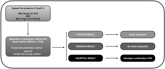 The loss of susceptibility to beta-lactam antibiotics in Gram-negative bacteria is an emerging problem worldwide and is mainly attributable to the production of beta-lactamases, especially extended-spectrum (ESBL) and AmpC type (AmpC-BL) beta-lactamases and carbapenemases [1]. The CESPM group (Citrobacter freundii, Klebsiella aerogenes, Enterobacter cloacae, Serratia marcescens, Providencia stuartii, and Morganella morganii) comprises common Enterobacteriaceae species responsible for nosocomial and community infections produced by inducible chromosomal AmpC beta-lactamases. However, other more prevalent species in patients, such as Escherichia coli and Klebsiella pneumoniae, can present these enzymes with plasmid gene encoding (pAmpC-BL). There has been limited research on pAmpC-BL in comparison to the more frequently detected ESBL- and carbapenemase-producing microorganisms [1,2,3]. There has been no estimate of the true worldwide prevalence of pAmpC-BL-producing microorganisms [4], and no consensus on the most effective laboratory technique for their detection [5]. AmpC-BL-producing microorganisms can also be associated with other types of resistance, highlighting the coexistence of AmpC-BL and ESBL [3].
