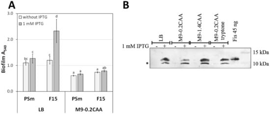Thus, the effect of fis-overexpression on F15 mature biofilm was prominent in the presence of tryptone (Figure 6C,D) but not in the absence of tryptone (Figure 5A,B). In addition, the young F15 biofilm lacked the effect of fis-overexpression in tryptone-containing medium (Figure 5C,D), being consistent with previously obtained F15 results in LB [8].