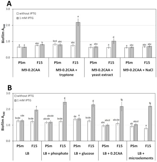 The biofilm of P. putida strains PSm and F15 in media supplemented with individual components. (A) Biofilm formation in M9-0.2CAA supplemented with single components of LB, and (B) biofilm formation in LB medium supplemented with single components of M9-0.2CAA. The arithmetical averages of at least four independent measurement sets are shown. Brackets show the 95% confidence intervals, and the homogenous groups are shown above columns by the lower-case letters. Identical letters denote non-significant differences (p ≥ 0.05) between averages of biofilm.