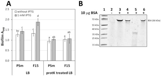 The effect of LB proteinaceous component for P. putida biofilm. (A) The biofilm of P. putida strains PSm and F15 in LB medium and the proteinase K-treated LB medium. Biofilm of P. putida strains. The arithmetical averages are shown. Brackets show the 95% confidence intervals, and the homogenous groups are shown above columns by the lower-case letters. Identical letters denote non-significant differences (p ≥ 0.05) between averages of biofilm. (B) SDS-gel electrophoresis LB medium supplemented with BSA. Lane 1, protein marker; lane 2, 10 μL of LB medium; lane 3, 10 μg of BSA; lane 4, LB medium + BSA without proteinase K treatment; lane 5, LB medium + BSA after 2 h proteinase K treatment; lane 6, proteinase K-treated LB medium amended with 10 μg of BSA after incubation in 121 °C and incubated at 37 °C for 2 h.