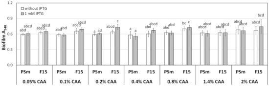 The biofilm of P. putida strains PSm and F15 in M9 media was amended with different amounts of CAA. The arithmetical averages of at least two independent measurement sets are shown. Brackets show the 95% confidence intervals, and the homogenous groups are shown above the columns by the lower-case letters. Identical letters denote non-significant differences (p ≥ 0.05) between averages of biofilm.
