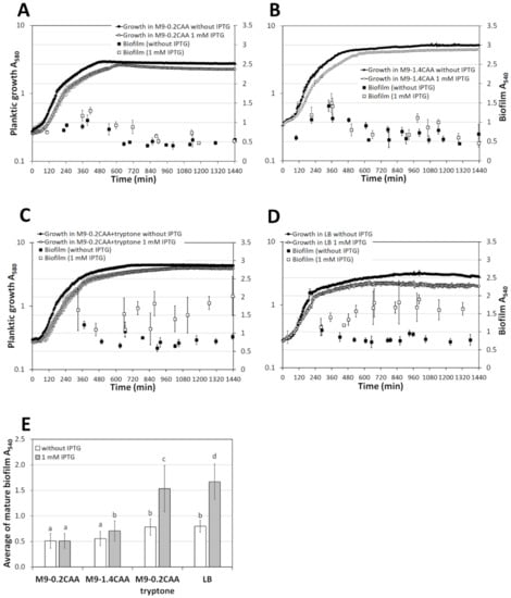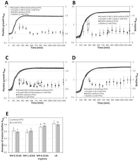 The biofilm dynamics and growth curves of P. putida wild type strain PSm grown in (A) M9-0.2CAA, (B) M9-1.4CAA, (C) M9-0.2CAA+tryptone, and (D) LB media with and without 1 mM IPTG supplementation. (E) The average mature biofilm of PSm was calculated from timepoints 8 to 24 h. The arithmetical averages are shown. Brackets show the 95% confidence intervals, and the homogenous groups are shown above the columns by the lower-case letters. Identical letters denote non-significant differences (p ≥ 0.05) between averages of biofilm.