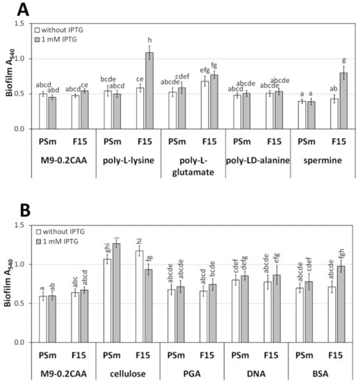The biofilm of P. putida in M9-0.2CAA supplemented with biopolymers. (A) The biofilm of P. putida strains PSm and F15 in the M9-0.2CAA medium supplemented with 0.4 mg/mL of poly-L-lysine (pK), 0.4 mg/mL of poly-L-glutamate (pE), 1.4 mg/mL of poly-LD-alanine (pA), or 0.4 mg/mL of spermine. (B) The biofilm of P. putida in M9-0.2CAA supplemented with water-soluble Na-cellulose, poly-galacturonic acid (PGA), salmon sperm DNA, and bovine serum albumin (BSA). The arithmetical averages of at least three independent measurement sets are shown. Brackets show the 95% confidence intervals, and the homogenous groups are shown above columns by the lower-case letters. Identical letters denote non-significant differences (p ≥ 0.05) between averages of biofilm.