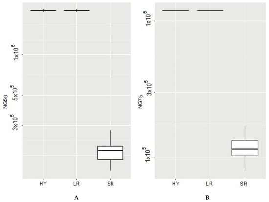 NG50 (A) and NG75 (B) values for hybrid assembly (HY), long-read assembly (LR), and short-read assembly (SR) of 18 clinical Brucella melitensis isolates. NG50 and NG75 are the length of the shortest contig at 50% and 75% of the total reference genome length, respectively.