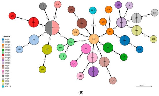 Prior work investigating outbreaks and regional clustering of B. melitensis has noted that up to six allelic differences would be considered an acceptable threshold to consider clustered isolates on a gene-by-gene phylogenetic analysis (cgMLST) as epidemiologically related [56]. Studies in our region [13,14] and our cumulative experience in local investigations of brucellosis (unpublished data) suggest up to 10–15 differing alleles or SNPs may still constitute a practicable threshold for relatedness. As seen in Figure 3, most sequenced isolates tend to cluster together according to short-read, long-read, and hybrid assemblies. However, in almost all cases, the long-read assemblies exhibited a much higher allelic difference from the hybrid assembly than the short-read assembly (Figure 3 Panel A). A similar finding was noted when the number of differing single-nucleotide polymorphisms (SNPs) was compared between long-read assemblies and hybrid assemblies and between short-read assemblies and hybrid assemblies (Figure 3 Panel B). For all clusters, the number of differing alleles between long-read and hybrid assemblies ranged between 13 and 203 allelic differences and 17 and 285 differing SNPs (median: 35.5 allelic differences, 42 differing SNPs). In comparison, the number of allelic differences between short-read and hybrid assemblies ranged between 1 and 3 allelic differences and 0 and 3 differing SNPs (median: 1 allelic difference, 0 differing SNPs). In 17 out of 18 isolates (94.4%), the number of differing alleles between long-read and hybrid assemblies was above the relaxed threshold (15 alleles) that would define epidemiological relatedness. Only one long-read/short-read/hybrid cluster (B10) fit within the parameters regarding less than 15 allelic differences (Figure 3, Panel A). Of note, the long-read assemblies of isolate B17 did not cluster with the short-read and hybrid counterparts at all; this mis-assignment is likely due to overall poor quality of long-read sequence in that sample (See: Q20% and Q30% results).
