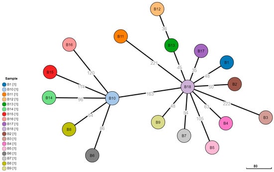 Minimum spanning tree of ad hoc cgMLST long-read assemblies of 18 clinical Brucella melitensis isolates. Numbers in grey denote number of allelic differences between the isolates, and the nodes are colored according to the isolate number.