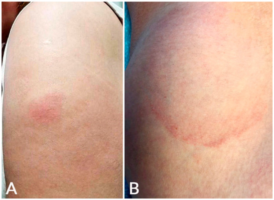 Local injection site reaction can be immediate (median of 1 day after first dose) or delayed (median of 7 days after first dose) [1]. Immediate site reaction can manifest with edema/erythema and often pain. DLLL, also called the ‘COVID arm’, occurs at or near the vaccination injection site [1,2]. This reaction was more common with mRNA-1273 than BNT162b2 and AZD1222 vaccination (Table 1), and this concurs with previous studies [1,2]. In the study by Català et al., the ‘COVID arm’ was much more common in females (95.4%) and is more likely to be associated with systemic symptoms (64.6%) than other post-vaccination eruptions [2]. It can manifest as a solitary pink patch or plaque associated with erythema, induration, pruritus, and/or tenderness (Figure 1) [7,8,9,10,11,12,13,14,15,16,17]. Severe reactions with lesion sizes of >10 cm have been reported [9]. Five patients (4.9%) in a cohort presented disseminated lesions [7]. Systemic symptoms such as fever, headache, and chills can be present [1,9].
