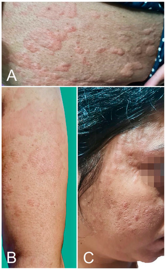 - Yu, J.N.; Angeles, C.B.; Lim, H.G.; Chavez, C.; Roxas-Rosete, C. Cutaneous reactions to inactivated SARS-CoV-2 vaccine and ChAdOx1-S (recombinant) vaccine against SARS-CoV-2: A case series from the Philippines. J. Eur. Acad. Dermatol. Venereol. 2021, 35, e841–e845. [Google Scholar] [CrossRef]