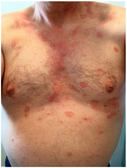 - Busto-Leis, J.; Servera-Negre, G.; Mayor-Ibarguren, A.; Sendagorta-Cudós, E.; Feito-Rodríguez, M.; Nuño-González, A.; Montero-Vega, M.D.; Herranz-Pinto, P. Pityriasis rosea, COVID-19 and vaccination: New keys to understand an old acquaintance. J. Eur. Acad. Dermatol. Venereol. 2021, 35, e489–e491. [Google Scholar] [CrossRef] [PubMed]