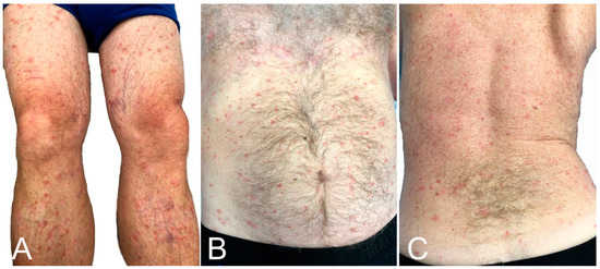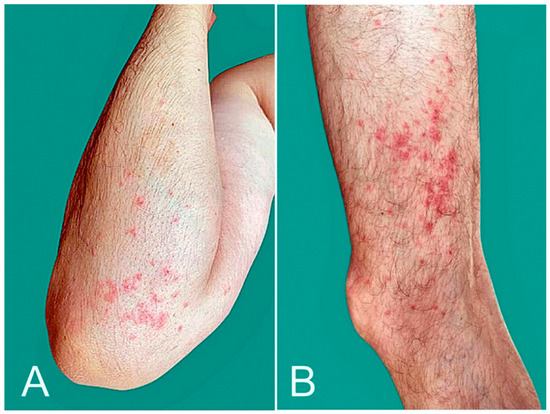 Psoriasis vulgaris [23,77,78], generalized pustular psoriasis [79], guttate psoriasis [80], palmoplantar psoriasis [81], and cutaneous lupus [23,82] have flared or developed after vaccination. These authors report a similar case (Figure 6). Atopic dermatitis [23], Darier’s disease [83], and lichen planus [84] can also flare post-vaccination.