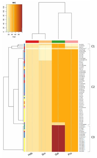 Minimum inhibitory concentration (MIC, mg/L) of 4-hydroxybenzoic (Hdb, 40–2.5 mM), syringic (Srn, 25–1.56 mM), gallic (Gal, 100–6.25 mM) and protocatechuic (Pro, 50–3.12 mM) acids. Phenolic compound concentration is defined by different colours shades, from yellow (0 mg/L) to red (100 mg/L). Rows of the dendrogram: LAB species: Lpl, Lpb. plantarum, Lpa, Lpb. paraplantarum, Lpe, Lpb. pentosus; isolation source: vegetables (violet), sourdoughs (blue), olives and derived products (yellow), dairy products (red), wine (orange), human sources (green), meat products (brown), unknown sources (pink). Rows of the dendrogram show similarity relationships between strains based on phenolic compounds tolerance. Columns of the dendrogram show the similarity among the effect of phenolic compounds on Lactiplantibacillus strains.