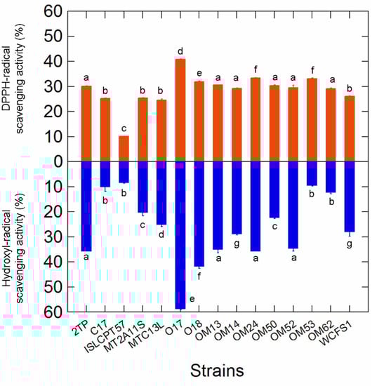 DPPH and hydroxyl radical scavenging activities in the 15 selected Lactiplantibacillus strains. Letters on plot bars indicate significant differences (Tukey′s HSD, p < 0.01) in scavenging activity within strains.