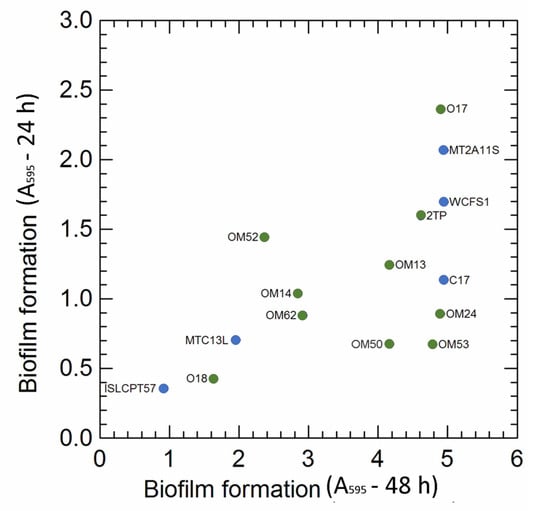 Biofilm formation in the 15 selected Lactiplantibacillus strains after 24 and 48 h incubation. Colour: green Lpb. pentosus strains (isolated from olive and brine); blue, Lpb. plantarum strains (isolated from other sources, e.g., sourdoughs, cheese, human).