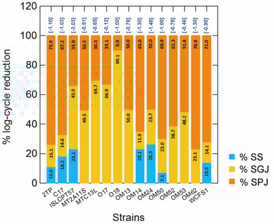Percentage (%) of log cycle reduction measured at each step (numbers within bars) of simulated gastro-intestinal (GIT) transit (simulated saliva, SS; simulated gastric juice, SGJ; simulated pancreatic juice, SPJ). For each strain, survival was calculated as a reduction of log(N/N0), where N0 and N are the number of cells before and after exposure to each stress. The numbers in brackets, over the bars, indicate the overall log cycle reduction after all steps (complete simulated GIT transit).