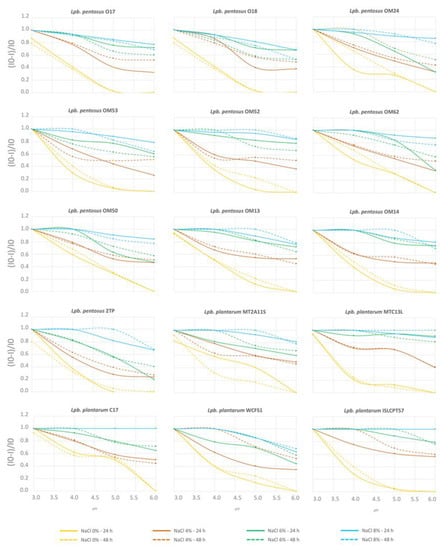 In this study, the ability to grow at different combinations of NaCl concentrations and pH values was evaluated using a synthetic medium. The harshest combination (8% NaCl, pH 3.0) inhibited the growth of all strains after both 24 and 48 h of incubation (Figure 6). Overall, salt concentrations ≥ 6% NaCl significantly impaired strain cultivation, regardless of the pH conditions. Survival in less severe combinations (i.e., NaCl ≤ 6%; pH ≥ 4.0–4.5 commonly reached during olive fermentation), however, was also strain-specific.