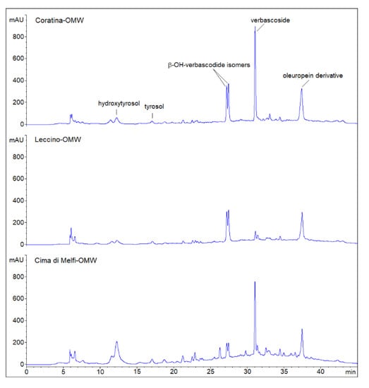 Phenolic profiles (HPLC chromatograms) of olive mill wastewater (OMW) resulting from olive oil production of Leccino, Coratina and Cima di Melfi cultivars. Peaks have been putatively assigned on the basis of retention time values (min) and by comparing them with literature data and UV spectra (280 nm).