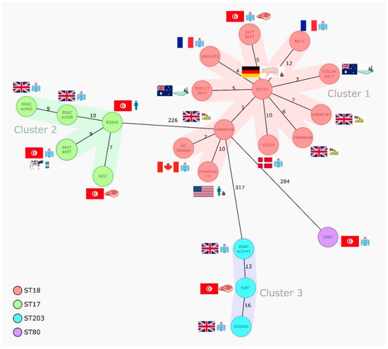 Based on the cgMLST data retrieved from the analysis of the second set of 24 sequenced isolates (Figure 1), three main clusters were observed. Cluster 1 included ST18/CT222 strains (n = 13) from clinical, human, retail meat, and environmental sources in eight countries during 2000–2017, and they mostly carried the same antibiotic resistance genes encoding for aminoglycosides (aph(3′)-III and/or ant(6)-Ia), macrolide-lincosamide-streptogramins A/B (erm(B), msr(C), Inu(B), and/or Isa(E)), tetracyclines (tet(M), tet(L), and/or tet(O)), and trimethoprim (dfrG), with two French isolates harboring vancomycin-resistance genes, in addition to pbp5 mutations conferring ampicillin resistance (Table 1). Cluster 2 grouped ST17/CT948 strains (n = 6) obtained from hospitalized patients in the UK and Tunisia (2003–2014) together with isolates from farm animals and retail meat in Tunisia (2016). Interestingly, common pools of antibiotic resistance genes were observed for the oldest isolates (aac(6′)-aph(2″), aph(3′)-III, ant(6)-Ia, erm(A), erm(B), and/or msr(C)) (2003–2004) and the most recent ones (vanHAX, aph(3′)-III, ant(6)-Ia, erm(B), and/or msr(C)) (2014–2016), irrespective of their origin, and all showed common mutations compatible with ampicillin and quinolone resistance (Table 1). Cluster 3 grouped three ST203/CT184 strains obtained from hospitalized patients in UK/2007 and retail meat in Tunisia over 2010–2016 that showed similar antibiotic-resistance gene patterns (aac(6′)-aph(2″), aph(3′)-III, ant(6)-Ia, erm(B), msr(C), Inu(B), tet(M), and/or vanHAX) and mutations compatible with ampicillin and quinolone resistance (Table 1). Isolates from the three clusters, including those from animal/meat sources, were equally enriched in several different virulence markers (Table 2) involved in adhesion (e.g., acm and sgrA), the formation of biofilms and pili (empABC), intestinal colonization (e.g., ptsD), response to stress (gls genes), etc., that have been previously linked to an increased pathogenicity [18]. Only isolates from cluster 2 (ST17) and cluster 3 (ST203) carried hylEfm and ecbA, probably as a result of plasmid selection and clonal expansion, respectively.