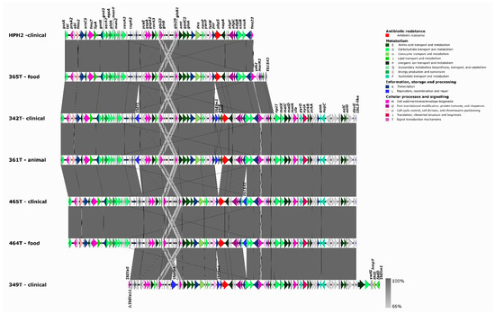 3.3. Identity of Ampicillin-Resistant Strains and Their Resistome, Virulome, and Bacteriocinome between Human Clinical, Animal, and Food Samples