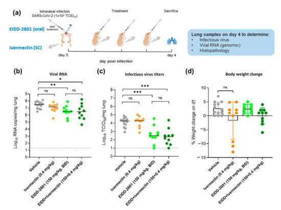 All virus-related work was conducted in the high-containment BSL3 facilities of the KU Leuven Rega Institute (3CAPS) under licenses AMV 30112018 SBB 219 2018 0892 and AMV 23102017 SBB 219 2017 0589 according to institutional guidelines. The hamster infection model of SARS-CoV-2 has been described before [19]. Briefly, 6–8 weeks female SG hamsters were treated with vehicle, ivermectin (0.4 mg/kg, once daily (QD) subcutaneously), molnupiravir (EIDD-2801, 150 mg/kg, BID orally) or combination of both drugs (ivermectin 0.4 mg/kg QD+EIDD-2801 150 mg/kg BID) for four consecutive days starting one hour before intranasal infection with 50 µL containing 1 × 104 TCID50 of SARS-CoV-2 Beta B.1.351 variant (derived from hCoV-19/Belgium/rega-1920/2021; EPI_ISL_896474, 2021-01-11) [19]. At day four post-infection (pi), the animals were euthanized for sampling of the lungs and further analysis by i.p. injection of 500 μL Dolethal (200 mg/mL sodium pentobarbital). Lungs were collected for quantification of subgenomic viral RNA using N2 primers and probes targeting the viral nucleocapsid [20], infectious virus titers, and lung histopathology as described previously [20] (Figure 1a).