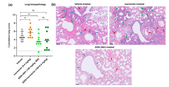 Lung histopathology of SARS-CoV-2-infected Syrian hamsters following treatment with ivermectin as a single or combination therapy. (a) Cumulative severity score from H&E stained slides of lungs from control (vehicle-treated ivermectin-treated (0.4 mg/kg, QD), EIDD-2801-treated (150 mg/kg, BID) and combination-treated (EIDD-2801+ivermectin at 150 mg/kg BID+0.4 mg/kg QD) SARS-CoV-2 (B.1.351)-infected hamsters at day 4 post-infection (pi). Individual data and median values are presented, and the dotted line represents the median score of untreated non-infected hamsters. Data were analyzed with the Mann−Whitney U test. * p < 0.05, ns = non-significant. Data are from two independent experiments with n = 14 for vehicle group and n = 10 for the other groups. EIDD = EIDD-2801. (b) Representative H&E images of lungs of control (vehicle-treated), ivermectin-treated and EIDD-2801-treated SARS-CoV-2 (B.1.351)-infected hamsters at day 4 post-infection (pi). Lung from vehicle control group showed peribronchial inflammation with intrabronchial cell debris (blue arrows), perivascular inflammation with endothelialitis (red arrows), and bronchopneumonia (green arrows) surrounded by intra-alveolar hemorrhage. Image of the lung from the ivermectin-treated animal showed severe perivascular inflammation with vasculitis (red arrows), limited and focal peri-bronchial inflammation (blue arrows), and significant and multifocal bronchopneumonia (green arrows). On the other hand, the lung from the molnupiravir-treated animal (EIDD-2801) revealed very limited peribronchial (blue arrows) and peri-vascular (red arrows) inflammation. Scale bar 100 µM.