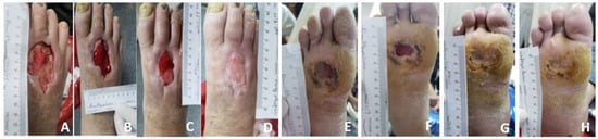 A 60-year-old male with DFU of 3 months duration on dorsal foot before application of SuDe + Lp (A); DFU treated with daily SuDe + Lp from day 1 to day 42 (B–D). A 58-year-old male with DFU of 3 months duration on plantar surface foot before application of SuDe + Lp (E) and daily application of SuDe + Lp from day 1 to day 35 (F–H).