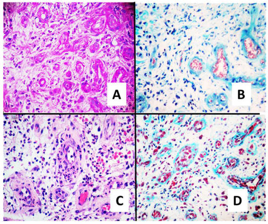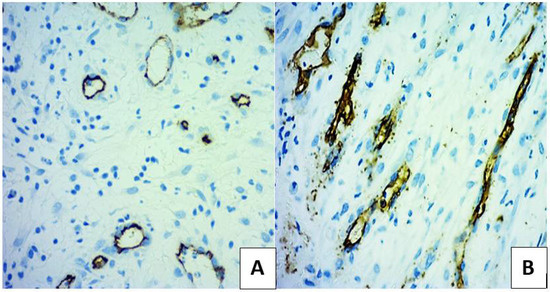 Tissue samples were fixed in 10% buffered formalin, and then dehydrated and embedded in paraffin. The sections of paraffin (5 µm thick) were stained with haematoxylin-eosin and Masson’s trichrome stain (collagen). For immunohistochemical analysis, a two-step immunohistochemical indirect method was performed using the Roche Ventana BenchMark ultraview histology equipment. The following primary antibodies were used: anti α-smooth muscle actin (anti-alpha-smooth muscle actin clone 1A4: miofibroblast, Abcam), anti CD34 (anti-human CD34 clone QBEnd 10, DAKO), anti CD68 (anti-human CD68, Roche-Ventana), and anti CD163 (anti-human CD163, Leica). In the second step, the slices were incubated with EnVision (Dako) for 1 h, and the color reaction was developed in 2% 3,3′-diaminobenzidine (DAB). Slices were counter stained with haematoxylin. Light microscopy was used to count the number of microvessels/endothelial cells and macrophages. Samples were evaluated using a Leica DMD 800 morphometric system microscope (Leica Microsystems, Wetzlar, Germany). A computerised morphometric study was performed using Image Pro plus vs. 4.5 software (Media Cybernetics, Silver Spring, MD, USA). Light microscopy was used to count the number of microvessels/endothelial cells in a standardised grid, at 20 or 40× magnification with the results expressed as microvessel density, vascular area, number of vessels, and endothelial cells. Density and distribution patterns of macrophages were determined by morphometric analysis at 20 or 40× magnification.