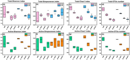 Similarly, microbial diversity of the active PAM and FLM communities also decreased significantly with increasing pressure (p < 0.05, Figure 1e–h and Table S4). Nevertheless, no significant differences were detected in microbial alpha diversity between the active PAM and FLM communities (p > 0.05, Figure 1e–h and Table S4).
