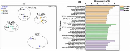 Linear discriminant analysis (LDA) (Figure 2b) indicated the significantly different indicator microbial groups under different pressures. Overall, a total of 13, 12, and 7 indicative phylotypes were detected at 0.1, 20, and 40 MPa, respectively, suggesting that high pressure significantly affected the microbial community composition and decreased the number of bioindicators. For instance, OTU156 (no-rank Gracilibacter) was obviously enriched at 0.1 MPa, whereas OTU117 (Pseudoalteromonas) and OTU395 (Tenacibaculum) were predominant at 20 and 40 MPa, respectively.